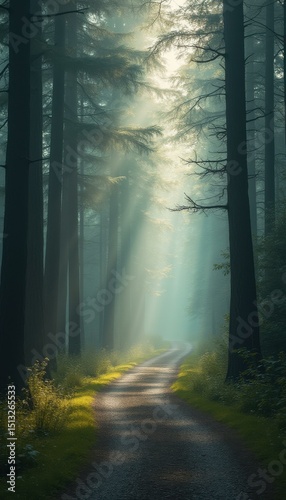 © vadosloginov, Naklejka premium Serene Forest Path: Sunlight Filtering Through Towering Trees, Creating a Mystical, Tranquil Escape into Nature