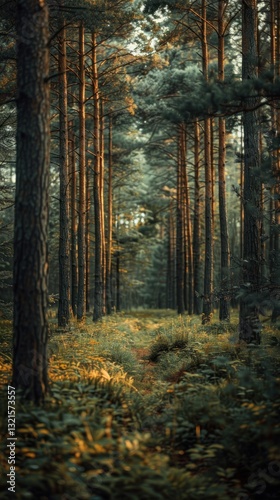 Naklejka premium Serene forest path, sunlight filters through pine trees, tranquil autumnal woods
