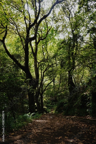 Obraz premium Serene Forest Path Surrounded by Lush Green Trees
