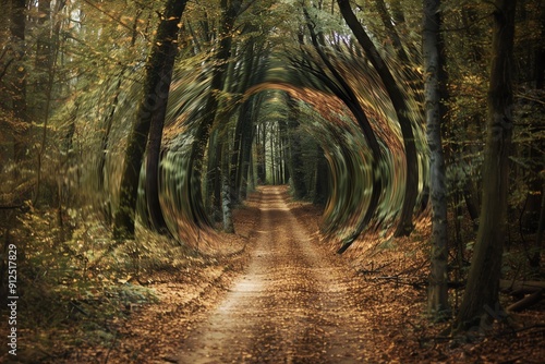 Obraz premium Serene forest path surrounded by lush trees and fallen leaves, inviting...