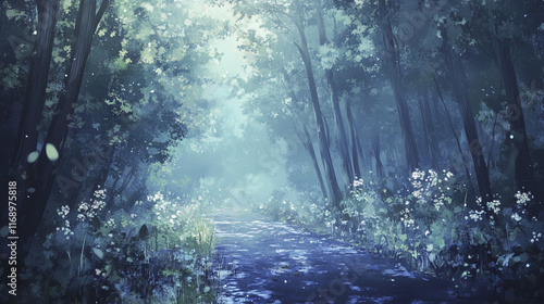 © THUA, Fototapeta premium serene forest path surrounded by tall trees and blooming flowers