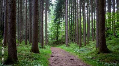 Obraz premium Serene forest path surrounded by tall trees and lush greenery on a calm day :...