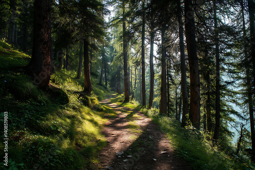 Obraz premium Serene forest path surrounded by tall trees, with sunlight filtering through...