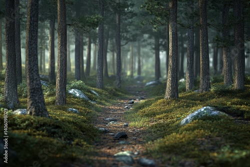 © YouraPechkin, Obraz premium Serene forest path surrounded by trees and moss on a misty morning