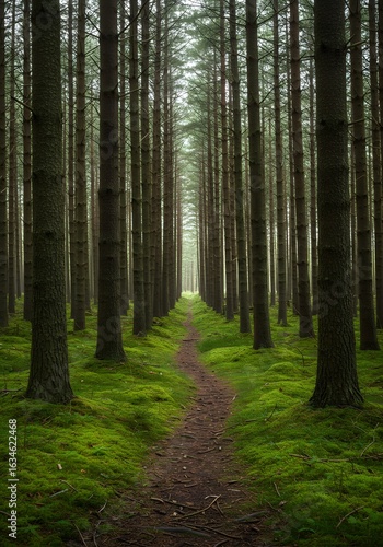 © SITI, Fototapeta premium Serene Forest Path: Tranquil Walk through a Misty Pine Wood with Green Moss