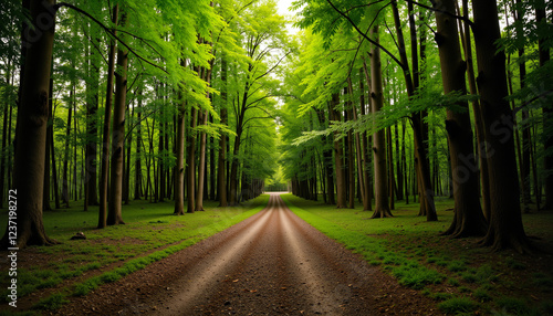 Obraz premium Serene forest path under dappled sunlight, equinox transition