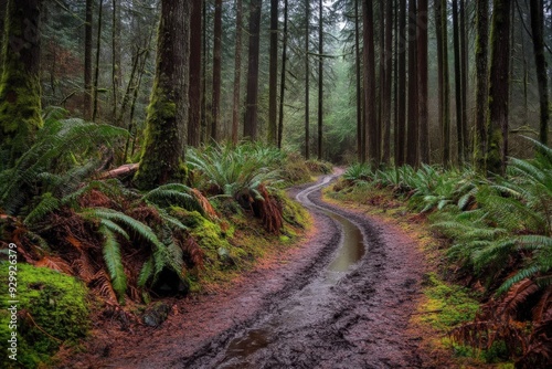© BrandwayArt, Fototapeta premium Serene forest path winding through lush greenery after rain