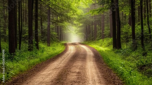Fototapeta premium Serene forest path winding through lush greenery, sunlight filtering through...