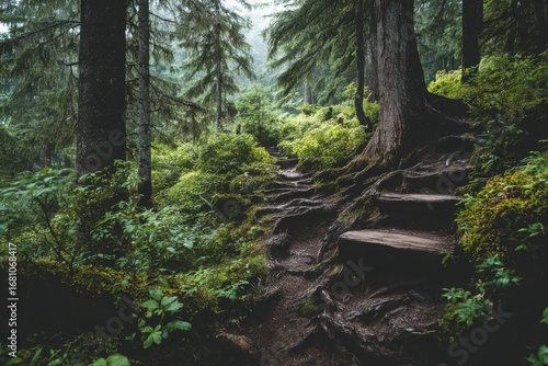 Fototapeta premium Serene forest path winding through lush greenery with moss-covered steps and...