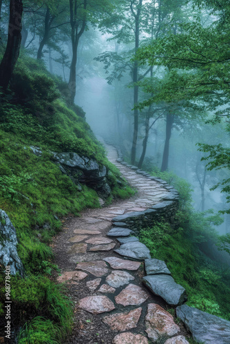 © Pui, Fototapeta premium Serene forest path winding through misty greenery, inviting exploration and tranquility in nature's embrace.