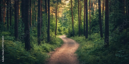 Fototapeta premium Serene forest path winding through tall trees, bathed in soft sunlight,...