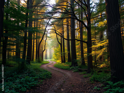 © Vectplus, Fototapeta premium Serene forest path winding through tall trees with golden sunlight filtering through the leaves in early evening