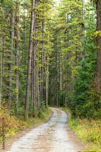 Obraz premium Serene forest path winds through tall trees. Nature's beauty. , Big Fork, Montana, USA.