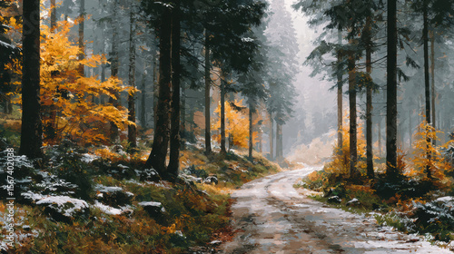 © Teeradej, Obraz premium Serene forest path winds through tall trees with autumn foliage and light dusting of snow, creating tranquil scene