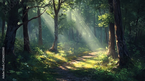 © Pattypatt, Obraz premium Serene forest path with dappled sunlight.