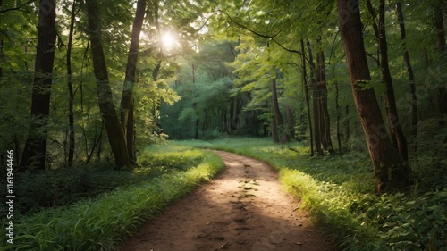 Fototapeta premium Serene Forest Path with Lush Greenery and Sunlit Woodland V2