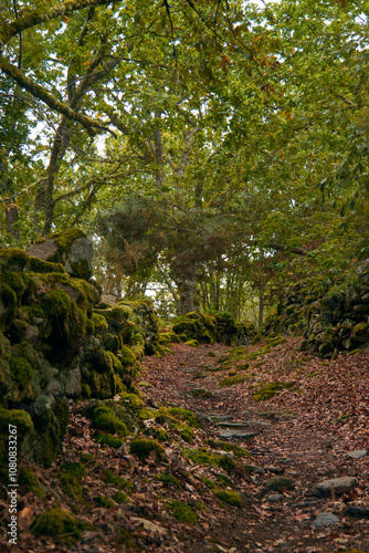 © Antonio, Fototapeta premium Serene Forest Path with Moss-Covered Walls