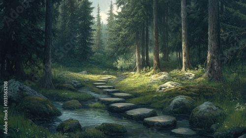 Fototapeta premium Serene Forest Path with Stream and Stones