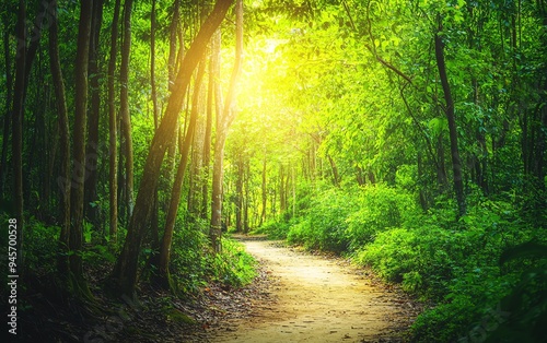 Obraz premium Serene forest path with sunlight filtering through lush green leaves, evoking...