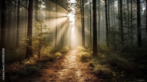 © CLOVER BACKGROUND, Fototapeta premium Serene Forest Path with Sunlight Rays