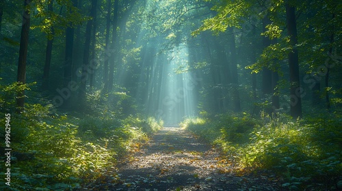 © frank29052515, Fototapeta premium Serene Forest Path with Sunlight Rays and Green Foliage