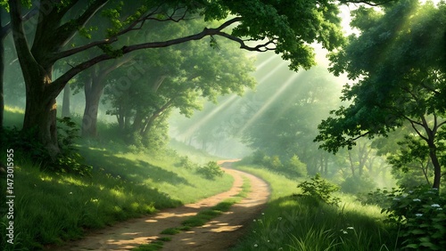 © MD, Obraz premium Serene Forest Path with Sunrays Through Lush Green Trees.