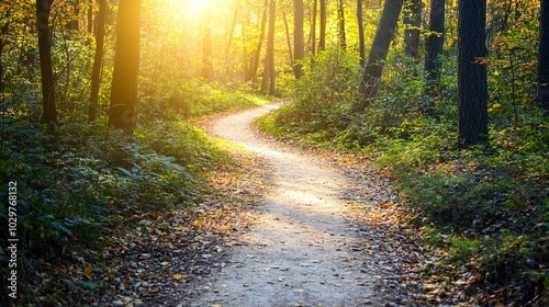 © CLOVER BACKGROUND, Fototapeta premium Serene Forest Pathway at Sunrise