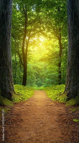 Naklejka premium Serene Forest Pathway Bathed in Golden Sunlight and Lush Greenery