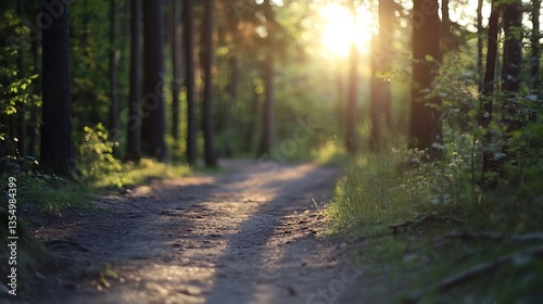 © Generative AI, Obraz premium Serene Forest Pathway Bathed in Golden Sunlight During the Early Morning Hours : Generative AI