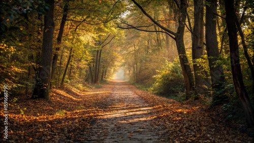 © Rosnani, Obraz premium Serene forest pathway during autumn, showcasing vibrant foliage and soft sunlight filtering through trees