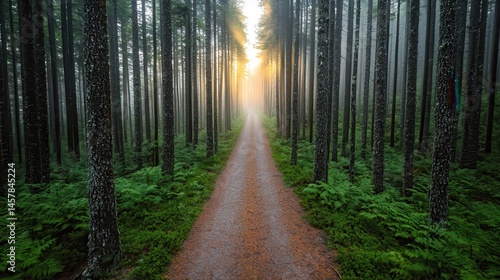 Obraz premium Serene Forest Pathway Emerging Through Mist and Sunlight Rays