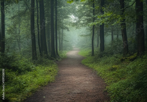 Fototapeta premium Serene Forest Pathway Enveloped in Misty Fog, Inviting Journey Through Lush...