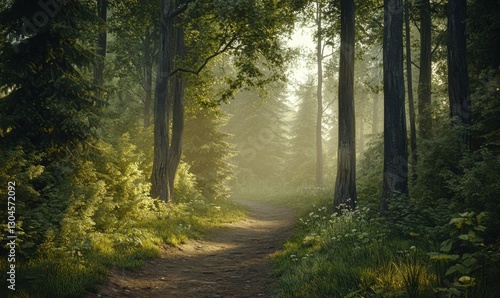Naklejka premium Serene forest pathway illuminated by dappled sunlight streaming through tall...