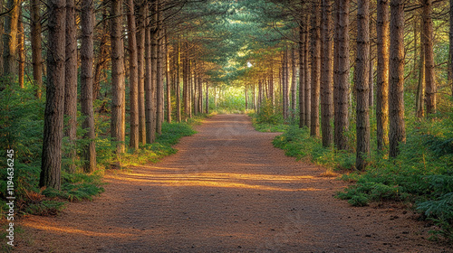 Obraz premium Serene forest pathway illuminated by golden sunlight in early morning hours