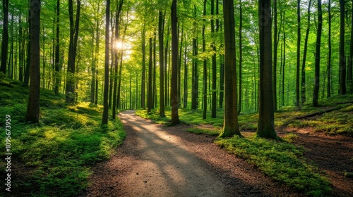 © Chronicles Artsy , Fototapeta premium Serene Forest Pathway Illuminated by Soft Sunlight, Featuring Lush Green Trees, Vibrant Foliage, and Tranquil Natural Environment Ideal for Relaxation and Rejuvenation
