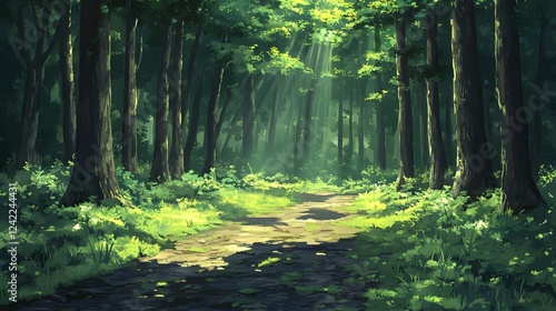 © QITIAN, Obraz premium Serene forest pathway illuminated by soft sunlight filtering through the trees.