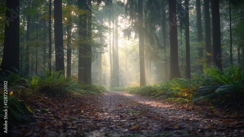 © AnanchaiP, Fototapeta premium Serene Forest Pathway Illuminated by Sunlight