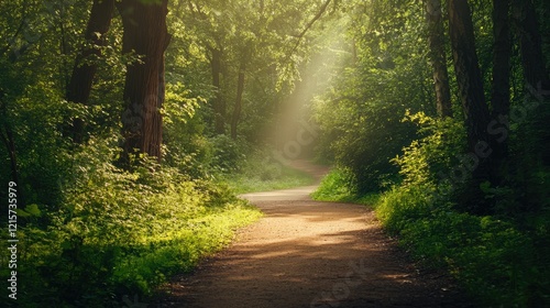 Fototapeta premium Serene forest pathway illuminated by sunlight with lush greenery and inviting...