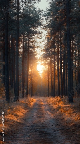 Obraz premium Serene forest pathway illuminated by warm sunset light.
