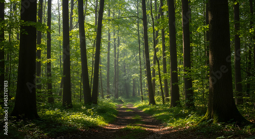 Fototapeta premium Serene Forest Pathway in Lush Green Woodland with Soft Light