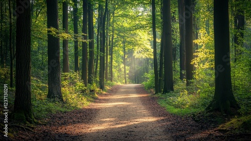 © Kitta Studio, Obraz premium Serene Forest Pathway Surrounded by Lush Green Trees and Sunlight