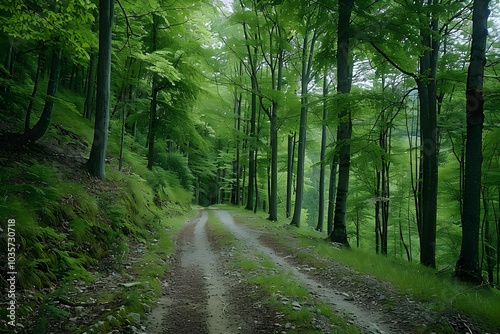 © Valentin, Fototapeta premium Serene Forest Pathway Surrounded by Lush Greenery