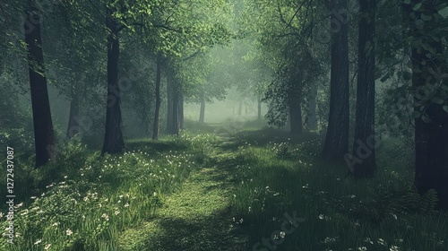 © Sakdecha, Obraz premium Serene Forest Pathway Surrounded by Lush Greenery and Light Mist