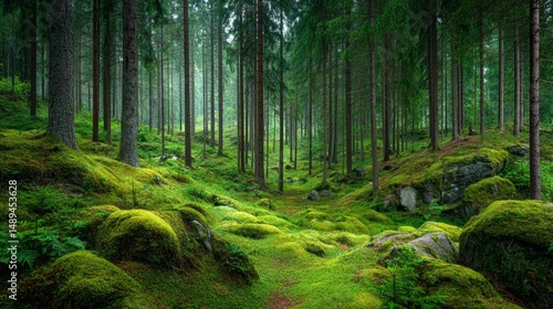 Obraz premium Serene Forest Pathway Surrounded by Lush Greenery and Moss-Covered Rocks in a Tranquil Woodland Environment