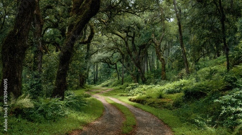 © Thanyaporn, Fototapeta premium Serene Forest Pathway Surrounded by Lush Greenery and Trees