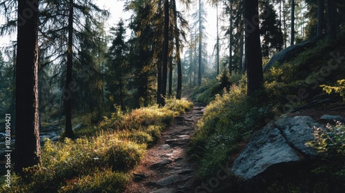 Fototapeta premium Serene Forest Pathway Surrounded by Tall Evergreen Trees and Sunlight...