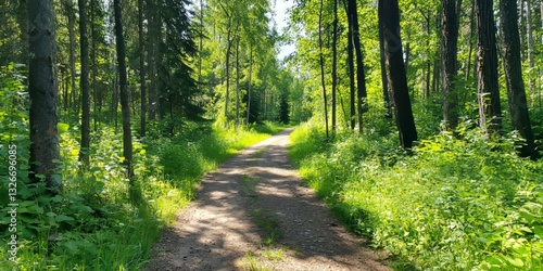 © Dewi, Fototapeta premium Serene Forest Pathway Through Lush Green Trees and Sunlight