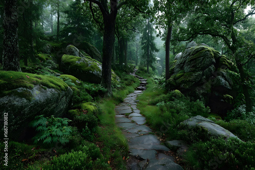 © D, Obraz premium Serene Forest Pathway Through Moss-Covered Rocks in Lush Woodland Landscape