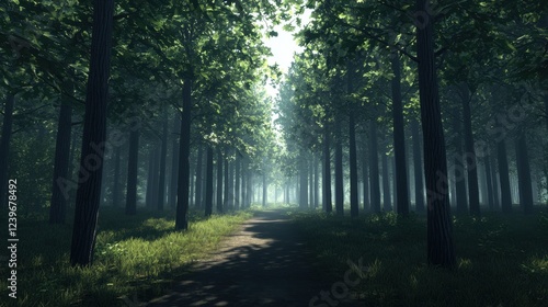 Fototapeta premium Serene Forest Pathway Through Tall Trees in Soft Morning Light