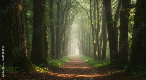 © sarinya, Obraz premium Serene Forest Pathway Through Tall Trees in Soft Morning Light